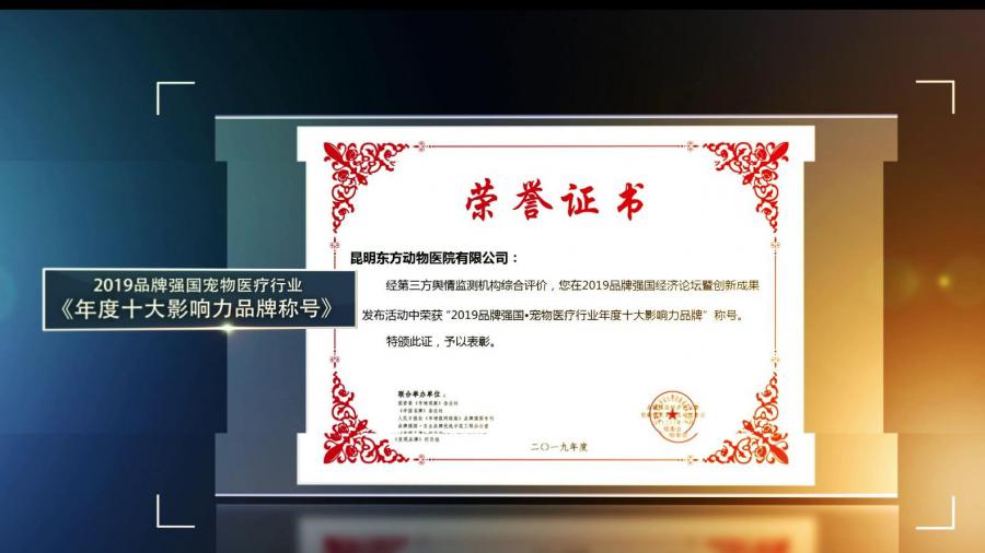 “2019品牌强国·宠物医疗行业年度十大影响力品牌”称号。